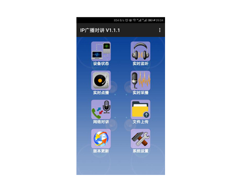 用途: 运行在Android平台手机,远程管理权限内的终端。 特点: Ø 通过Wifi无线网络登录到服务器,实现远程管理; Ø APP操作的终端范围和功能,均在服务器上进行权限管理,确保安全性; Ø 实现以下功能: A. 查看终端的运行状态、音量、任务等信息; B. 广播功能,对指定分区广播喊话或音乐; C. 对讲功能,对指定终端双向对讲; D. 可管理服务器的音频节目。
